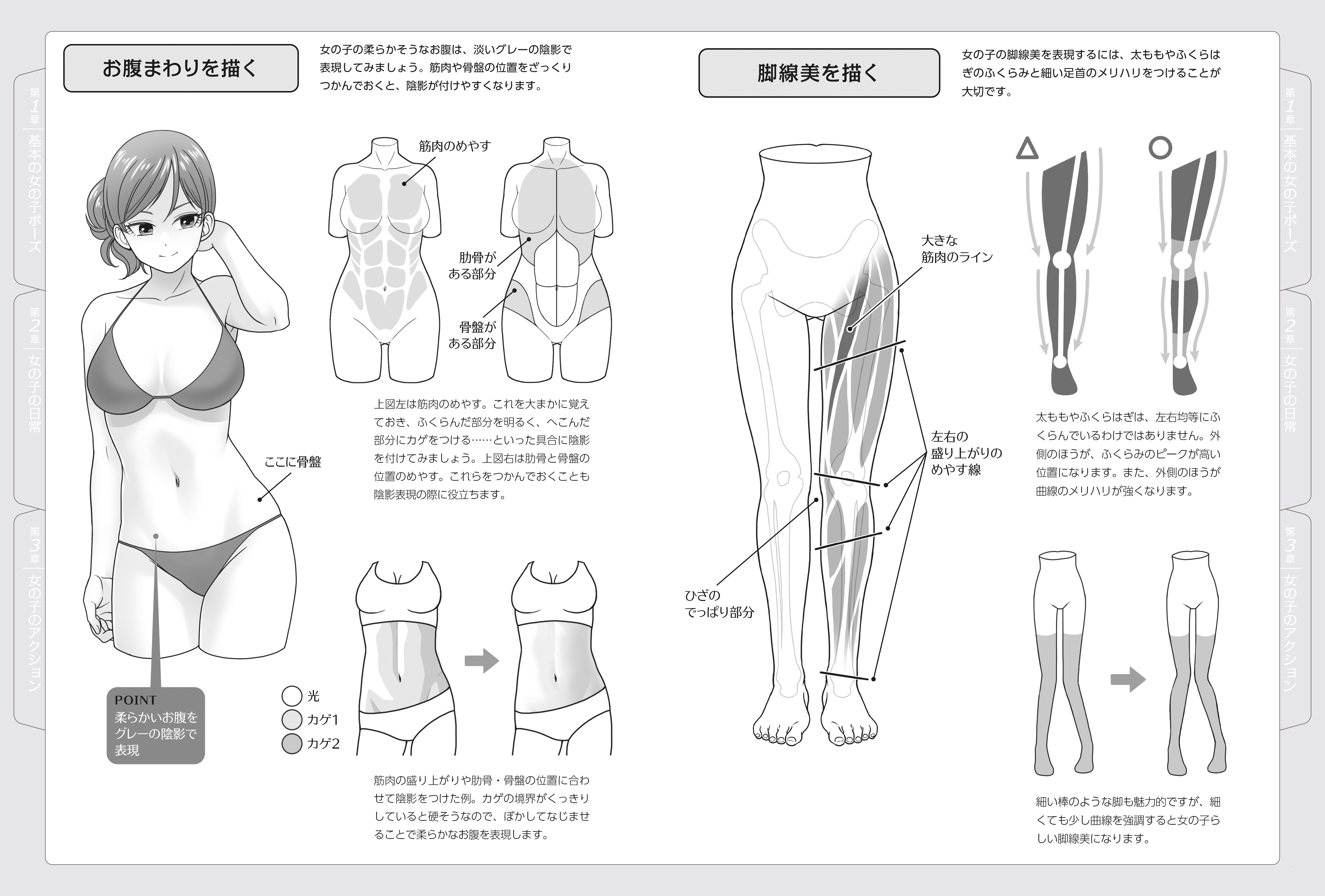 巻頭の解説ページでは、体型の異なる女の子の描き分けのコツや、性格が現れるポーズ描写のテクニックを解説。