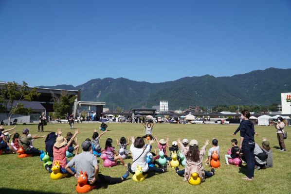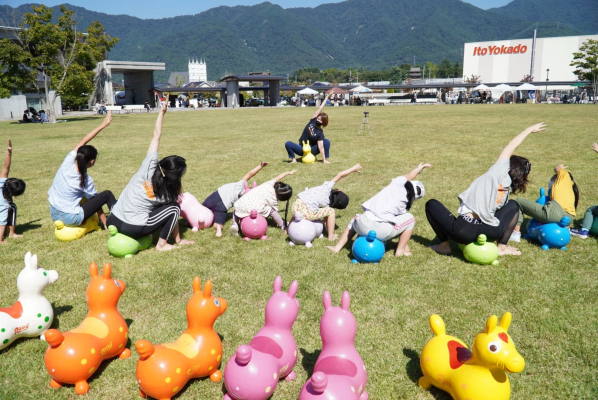晴天に恵まれ、上田市交流文化芸術センター「サントミューゼ」の交流芝生広場にて2日間全5回開催し、60名以上の親子が参加されました。当日は、ロディヨガ以外にも、缶バッジ作りや、ロディのイラストを使ったぬりえコーナーなど様々な企画が用意され、お子様連れのご家族がたくさん参加され、大きな賑わいを見せました。