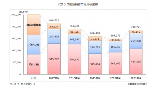 2021年度のパチンコ関連機器(パチンコ機、パチスロ機、周辺設備機器)の市場規模は7,387億円(メーカー売上金額ベース)となり、前年度比で124.3%、1,444億円のプラスとなった。大分類別(パチンコ機、パチスロ機、周辺設備機器)ではパチンコ機の市場規模は4,343億円(前年度比117.6%)、パチスロ機は2,592億円(同136.6%)、周辺設備機器は451億円(同128.8%)となり、何れも前年度から拡大した。