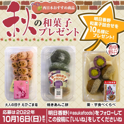 今回のキャンペーンでは西日本10月の人気商品、香ばしいえびを練り込んだ団子「大人の団子 えび・ごま塩」のほか、コシ自慢の白あんこ餅と、よもぎあんこ餅の詰め合わせ「焼きあんこ餅」、栗粒入り栗あんと、鹿児島県産の紅はるか芋あんを同時に味わえる「栗・芋食べくらべ」をセットにして10名様にプレゼントいたします。