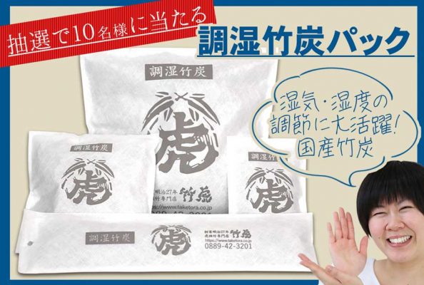 今回プレゼントする調湿竹炭パックは、お部屋の消臭や調湿に活躍する竹炭を不織布の袋に入れた除湿剤。調湿効果をしっかりと発揮しつつも、竹炭粒が外にこぼれることのない不織布で製造するために、こだわり抜いた、アイテムです。梅雨や夏場の湿気とり、調湿にお役立ていただけます。