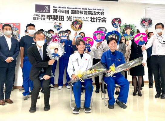 10月5日に株式会社丸信(福岡県久留米市)の社内にて、日本代表 甲斐田 光選手と、同行する手島副工場長の壮行会を執り行いました。
