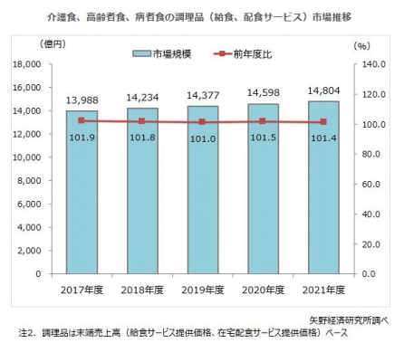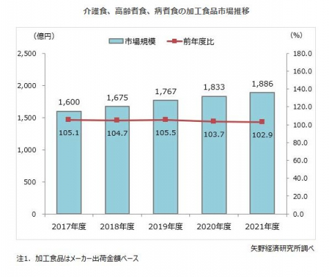2021年度の介護食、高齢者食、病者食を合算した国内市場規模は、加工食品(メーカー出荷金額ベース)が前年度比102.9%の1,886億円、調理品[末端売上高(給食サービス提供価格、在宅配食サービス提供価格)ベース]は同101.4%の1兆4,804億円と推計した。