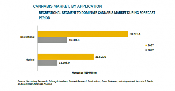 大麻の市場規模は、2022年の277億米ドルからCAGR24.3%で成長し、2027年には823億米ドルに達すると予測されています。大麻は、医療用、娯楽用ともに、世界的に合法化の渦中にあります。特に、北米地域は、国内のほとんどの州で合法化が進み、レクリエーション用の大麻の使用量が増加しているため、大麻市場を支配しています。さらに、大麻の、医療用途の拡大、社会的受容性の高まり、新技術の導入、研究開発および技術革新の増加により、今後の大麻市場を牽引することが予想されます。