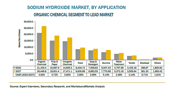 水酸化ナトリウムの市場規模は、2022年の493億米ドルからCAGR4.4%で成長し、2027年には611億米ドルに達すると予測されています。世界各国の住宅・非住宅インフラを含む建設業界の活況は、塗料・コーティング剤の需要を押し上げる主要な要因となっています。二酸化チタン市場は、建設業界や自動車業界における塗料・コーティングの用途に牽引されており、水酸化ナトリウム市場にも好影響を与えています。