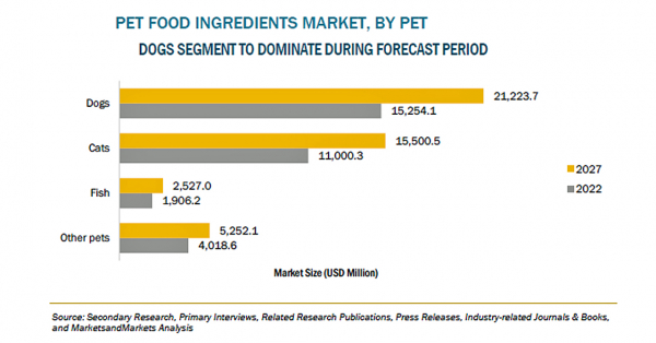 ペットフード成分の市場規模は、2022年の322億米ドルからCAGR6.7%で成長し、2027年には445億米ドルに達すると予測されています。ペットフード成分は、ペットフード製品の栄養価を高め、タンパク質、炭水化物、脂質、ビタミン、ミネラル、水分などの栄養所要量を満たすため構成され、犬、猫、魚、ウサギ、鳥、馬など、様々なペットに対応しています。また、飼い主間でペットの栄養に関する意識が高まり、ペットのヒューマニゼーションが進み、健康を重視したペットフード成分への支出が増加していることが、同市場の大きな牽引力になっています。ペットフード成分は、ペットの成長と発達をサポートし、ペットが体内で作ることのできないビタミンやミネラルを豊富に含み、ペットの嗜好性を高めるため、ペットオーナーの間で大きな需要があります。世界的なペット飼育率の上昇や技術の進歩により、近年、ペットフード成分の品質や保存性が向上しており、今後、同市場に大きなビジネスチャンスをもたらすと思われます。