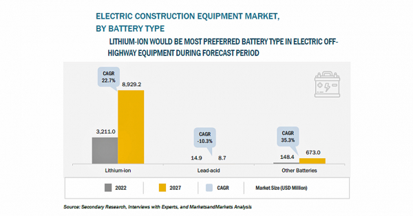 電動建設機械の市場規模は、2022年の92億米ドルからCAGR22.0%で成長し、2027年には248億米ドルに達すると予測されています。市場成長の主な要因は、オフハイウェイ機器からの排ガスを最小限に抑える需要の増加、地下採掘での換気コストの削減、住宅地での低騒音建設機械への需要などによるものです。