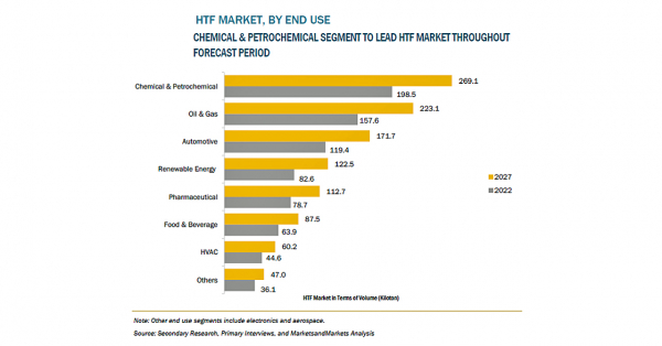 HTF(熱伝導流体)の市場規模は、2022年の37億米ドルからCAGR9.3%で成長し、2027年には58億米ドルに達すると予測されています。クリーンエネルギーへの需要の高まりに伴う集光型太陽光発電所の増加が、HTF市場の成長を促進しています。また、HTFは、化学、自動車、石油・ガス、再生可能エネルギー、食品・飲料、HVAC、製薬産業など、さまざまな最終用途産業で用途を見いだしています。