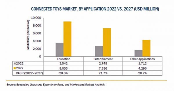 コネクテッドトイの市場規模は、2022年の80億米ドルからCAGR20.9%で成長し、2027年には207億米ドルに達すると予測されています。子供たちがよりインタラクティブで自己関与型の玩具に傾倒していることが、コネクテッドトイの需要を促進しています。コネクテッドトイは、親が子供の活動を理解し、遊びから親子の対話につなげるための情報を提供することで、親や家族が子供の成長を監視し、参加することを可能にします。