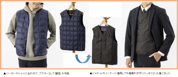 ■ ビジネスにもカジュアルにも、どんなシーンでも着用できるメンズのインナーダウン