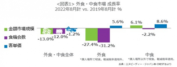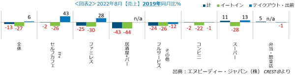外食・中食市場の2022年8月は、売上13.0%減(2019年同月比)