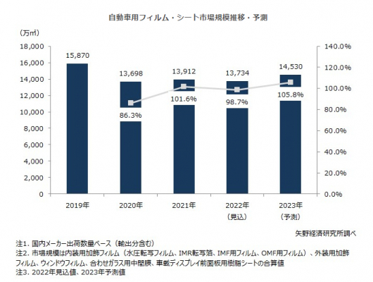 自動車用フィルム・シートの需要は自動車生産台数と概ね連動しており、2020年の自動車生産台数減少に合わせて大幅に縮小し、2021年にはやや持ち直したものの、2022年は世界の自動車生産の3割強を占める中国でのオミクロン株流行に伴い上海、広州などの都市ロックダウンが実施され、生産・物流ともに停滞したことに加え、ロシアによるウクライナ侵攻の長期化や米国の金利上昇による欧米市場の消費の冷え込みを受けたことで再び減少が見込まれる。ただ、2022年下期より中国でのロックダウンが解除され部材や車体などの流通が動き出したことで、自動車生産台数は急速に回復に向かっており、2023年の自動車用フィルム・シートの市場規模は前年比105.8%の拡大を予測する。