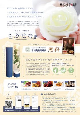 株式会社ナウい(本社所在地:東京都豊島区、代表取締役:桑山 裕史)は、株式会社Atumist(本社所在地:東京都台東区、代表取締役:山崎 薫)と業務提携し、当社が提供する結婚相談サービスBridalチューリップにて、指定飲食店で薔薇の一輪挿しをテーブルまで届けるサプライズプレゼントサービス「らぶはな」の提供を10月18日から開始いたしました。