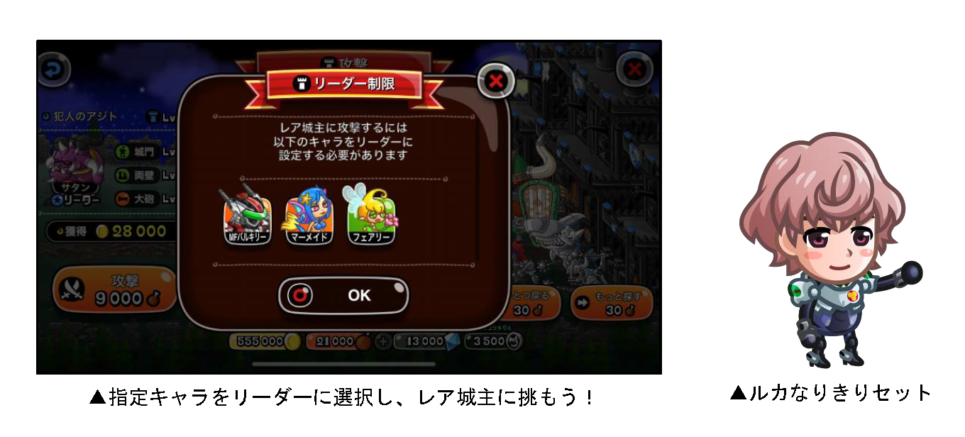 「バトル」から「ひとりで」または「みんなで」を選び、「攻撃」を選択すると、ランダムでレア城主が出現する“レア城主”イベント。極秘任務「ライブを守れ」では、まれに“犯人のアジト”に遭遇し、規定数勝利をすると限定剣士お着替え“ルカなりきりセット”がもらえます。