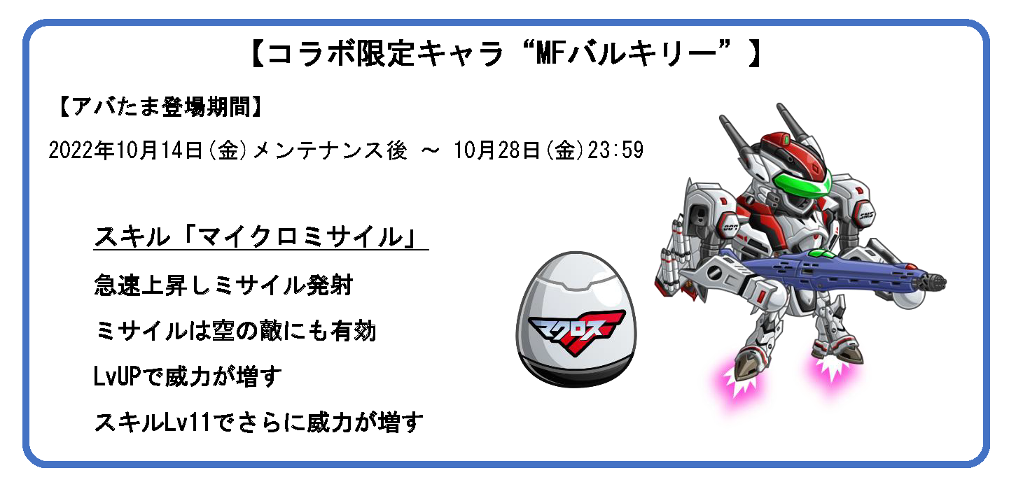 「コラボのアバたま」に限定キャラ“MFバルキリー”が再登場!“MFバルキリー”は初回当選でキャラタマゴが、以降は当選回数に応じて“VF-25(バトロイド)”、“VF-25F(ガウォーク)”“YF-29(バトロイド)”さらには“サヨナラノツバサ”といったお着替えが手に入ります。さらに今回のコラボでは新たに激レアお着替え“VF-25F/S(バトロイド)”がアバたまに追加されます。