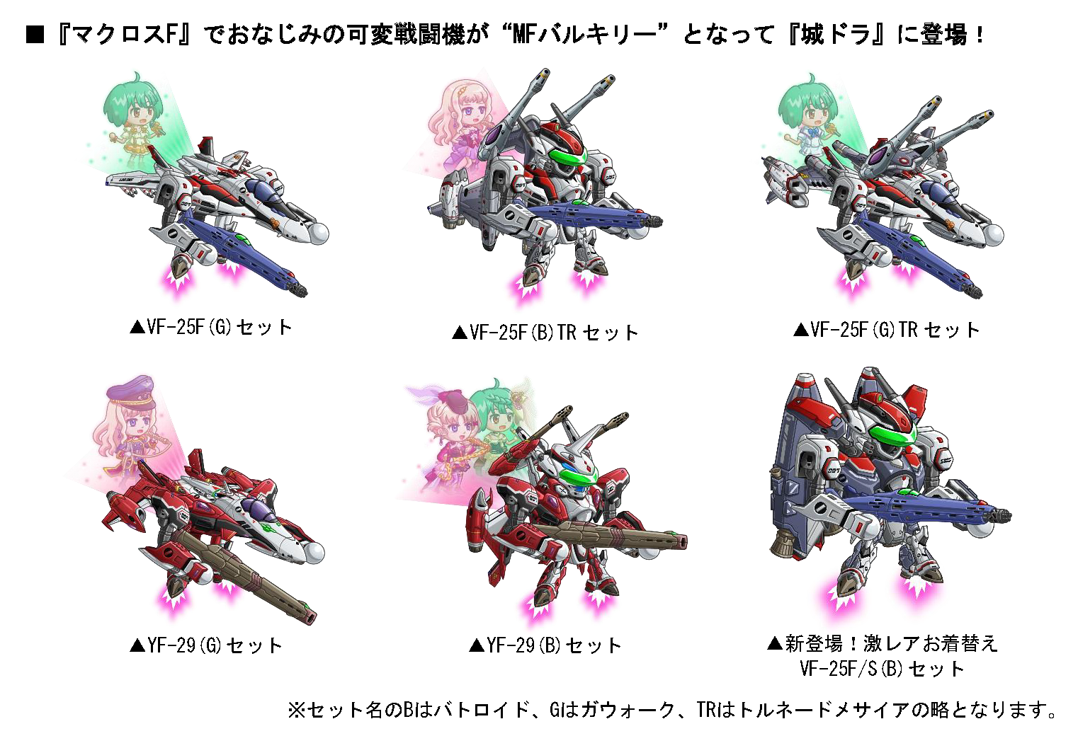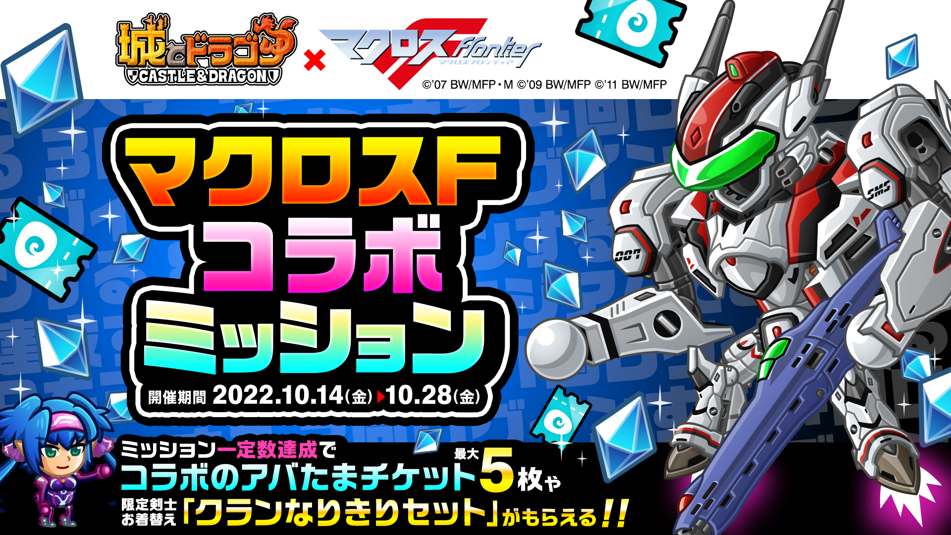 10月14日(金)より、アニメ『マクロスF』との復刻コラボイベントを開催いたします。期間中は、コラボ限定キャラ“MFバルキリー”が「コラボのアバたま」に登場。今回新たに、コラボ限定キャラ“MFバルキリー”の激レアお着替え“VF-25F/S(B)”や、城ドラキャラの激レアお着替え“シェリルセット”“ランカセット”が登場!また、レア城主イベントを規定数勝利すると剣士専用の限定お着替え“ルカなりきりセット”がプレゼントされます。さらに、城下町やバトルのBGMとして「トライアングラー(fight on stage)」が流れるなど、期間限定のデカルチャーなコラボをぜひお楽しみください。