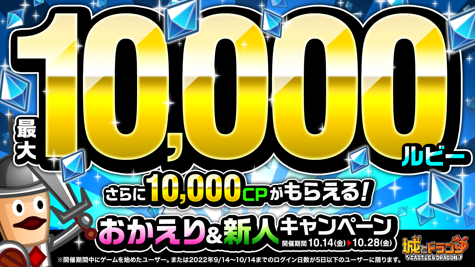 10月14日(金)より、対象ユーザーに最大10000ルビーや10000CPが贈られる「おかえり&新人キャンペーン」が開催中いたします。