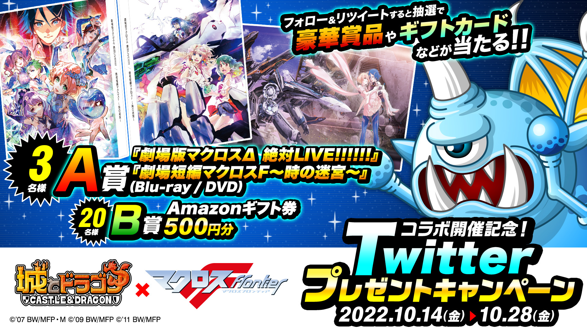 10月14日(金)より、コラボ開催を記念した「コラボ開催記念!Twitterプレゼントキャンペーン」を実施いたします。『城とドラゴン』公式Twitterアカウントをフォローし、対象ツイートをリツイートしていただいた方の中から抽選で、『劇場版マクロスΔ 絶対LIVE!!!!!! / 劇場短編マクロスF ~時の迷宮~』のBlu-ray/DVDやAmazonギフト券をプレゼントいたします。
