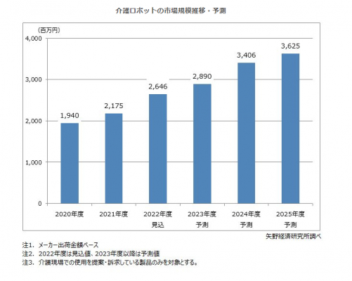 移乗支援、排泄支援、見守り支援分野の用途では、いずれも新製品や新規参入企業による新たな提案が出ており、新機能や使い勝手、価格で見直しが図られている。2023年度以降は、ユーザーニーズを反映させて機能や価格を見直している介護ロボットの新製品が牽引することで、2025年度の介護ロボット市場規模は36億2,500万円まで拡大すると予測する。新機能についてはこれから評価が定まる製品もあるが、徐々に導入が進むことで市場全体が普及に向けたステージを一段上がると期待できる。