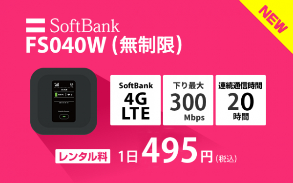 「SoftBank FS040W(無制限)」は、大容量モバイルバッテリーを搭載したモバイル Wi-Fiルーターのレンタル商品となります。