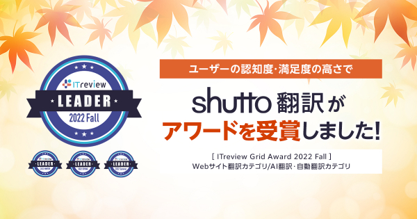 この度、Webサイト翻訳ツール「shutto翻訳」は、アイティクラウド社主催の「ITreview Grid Award 2022 Fall」において、【認知度】【満足度】ともにユーザーから高い評価を受け、Webサイト翻訳カテゴリー、AI翻訳・自動翻訳の2カテゴリーで、アワード「Leader」を受賞しました!