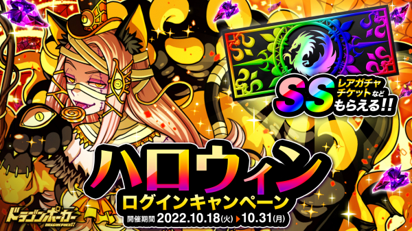 期間中、10日間ログインすると、竜石が最大10個もらえる「ハロウィンログインキャンペーン」を開催いたします。2日ログインごとに「女神スキルフェアリー」や「SS進化指輪」など豪華アイテムをプレゼント!ログイン10日目には「SSレアガチャチケット1枚」が必ずもらえます。『ドラゴンポーカー』に毎日ログインして、豪華報酬を受け取りましょう!