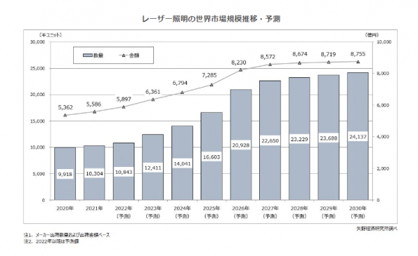 2022年のレーザー照明世界市場規模(メーカー出荷ベース)を1,084万ユニット、5,897億1,000万円と予測する。