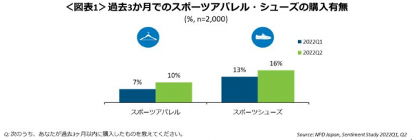 2022年7月に実施した、日本全国16-69歳の消費者2000人を対象とした自主調査「センチメント・スタディ」によると、2022年4-6月にスポーツアパレルを購入したのは消費者全体の10%、スポーツシューズを購入したのは16%でした(図表1)。同年1-3月と比べると、それぞれ3ポイント増であることが分かります。