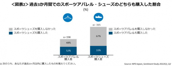 スポーツアパレル・シューズ購入層の重なり方を見ると、スポーツアパレル購入者の52%がスポーツシューズも、スポーツシューズ購入者の33%がスポーツアパレルも購入していることが分かります(図表2)。スポーツアパレルを購入する消費者は、スポーツシューズも購入する可能性が高いことが分かります。