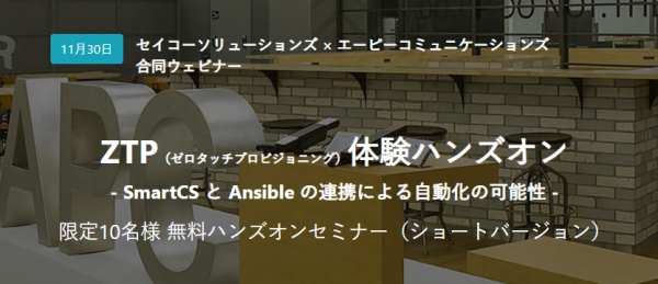 株式会社エーピーコミュニケーションズは、11月30日(水)に「ZTP(ゼロタッチプロビジョニング)体験ハンズオン- SmartCS と Ansible の連携による自動化の可能性 -(ショートバージョン)」をセイコーソリューションズ株式会社と合同で開催いたします。
