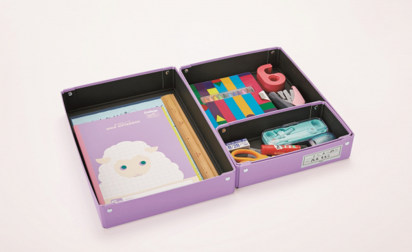 仕切り箱(W 228×D 110×H 55mm)を使って、文房具を使用頻度や大きさ別に分けて収納できます。前後好きな位置にスライドしたり、中身を入れたまま箱ごと取り出すことができるので、子どもが自分で整理収納しやすくなっています。