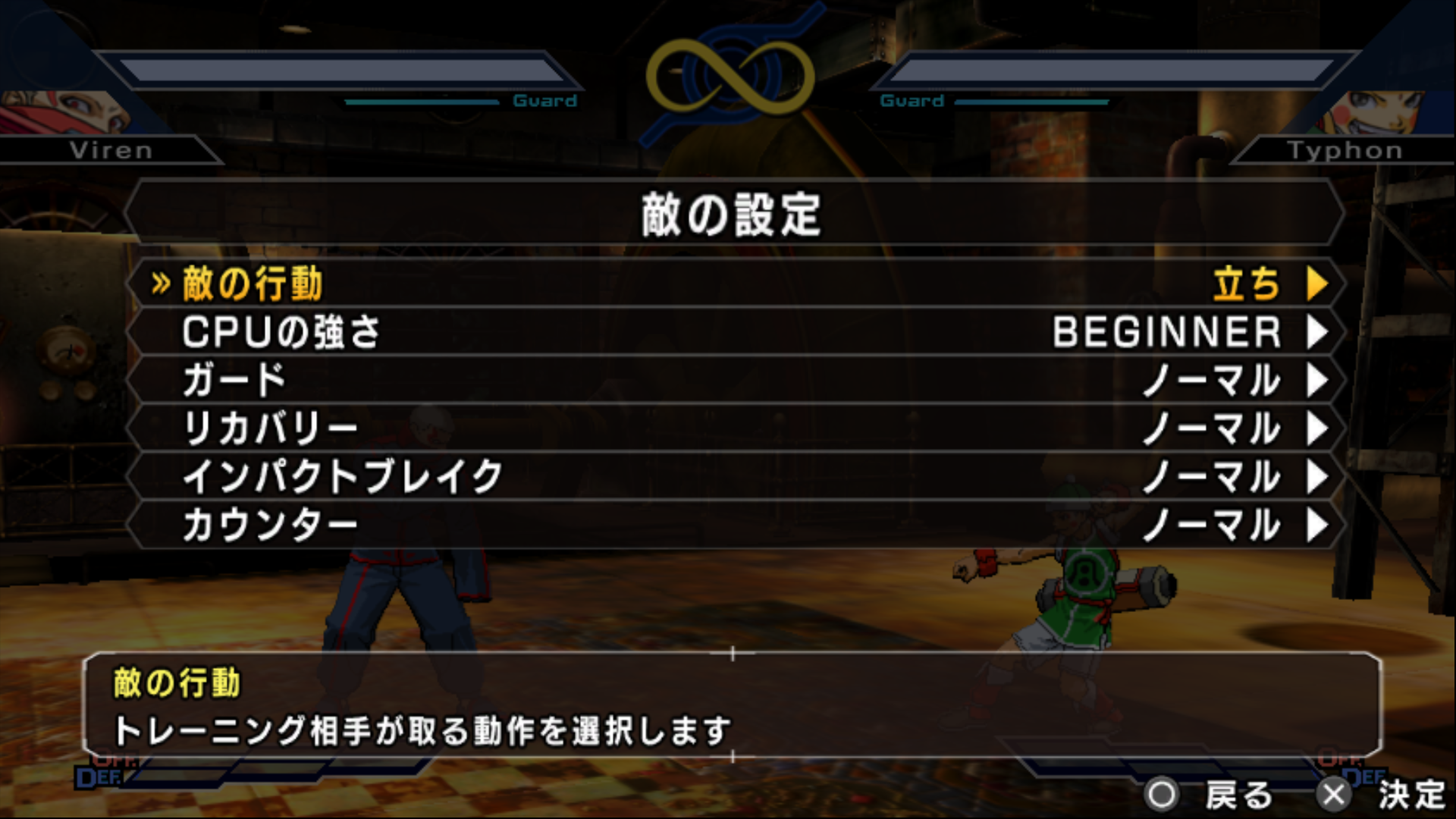 いつでもどこでもコンボの練習が可能なトレーニングモードを採用。CPUの強さを選べるだけでなく、オフェンスとディフェンスの2つのゲージの溜まり方や、攻撃、ガード、反撃などの挙動まで細かく設定し、腕を磨くことができます。