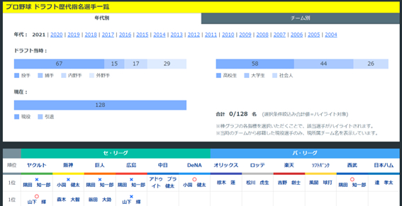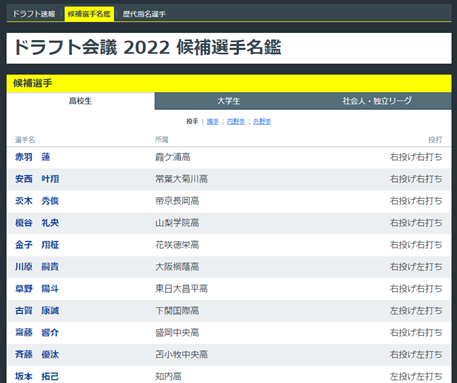 「ドラフト会議 2022 候補選手名鑑」では、今季のドラフト注目選手情報や候補選手のプロフィール、シーズン成績を掲載しております。加えて、ドラフト会議前からお愉しみいただけるコンテンツ「歴代氏名選手一覧」では、今季だけでなく現役から歴代まで幅広いドラフト候補選手情報も年代別・チーム別で閲覧いただけます。