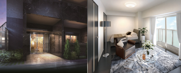 落ち着いたモノトーンで彩った外観。重厚感溢れるタイル貼の壁面に柔らかな光が反射するエントランス。道行く人の目を惹く空間が、住まう方やゲストを優しく迎え入れます。