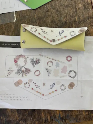 子供たちが2回にわたって書いてくれたデザイン画を社内でスキャン、プリントしたものを使い、オリジナルのペンケースを作成しています。地域の子供たちと交流を持って、Sobagniが持つ技術でちょっとだけエシカルレザーについて学んでいただき経験を通じて生きた学びを提供することを目標に参加しています。
