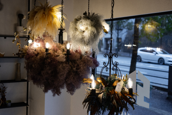 味わい深い存在感漂うシャンデリアは、経験豊富なフラワーアーティストが1点1点丁寧に時間をかけて手掛ける特別な一点ものです。オールハウス福岡店で展開するREUNIQUE商品は、インテリアやギフトにおすすめの3万円台のシャンデリアからリビングや玄関などに華やかさを添える5万円台~7万円台のシャンデリア、ショップディスプレイやウェディングシーンに存在感を放つ8万円台~10万円台のシャンデリアまで、大小さまざまな商品が並びます。