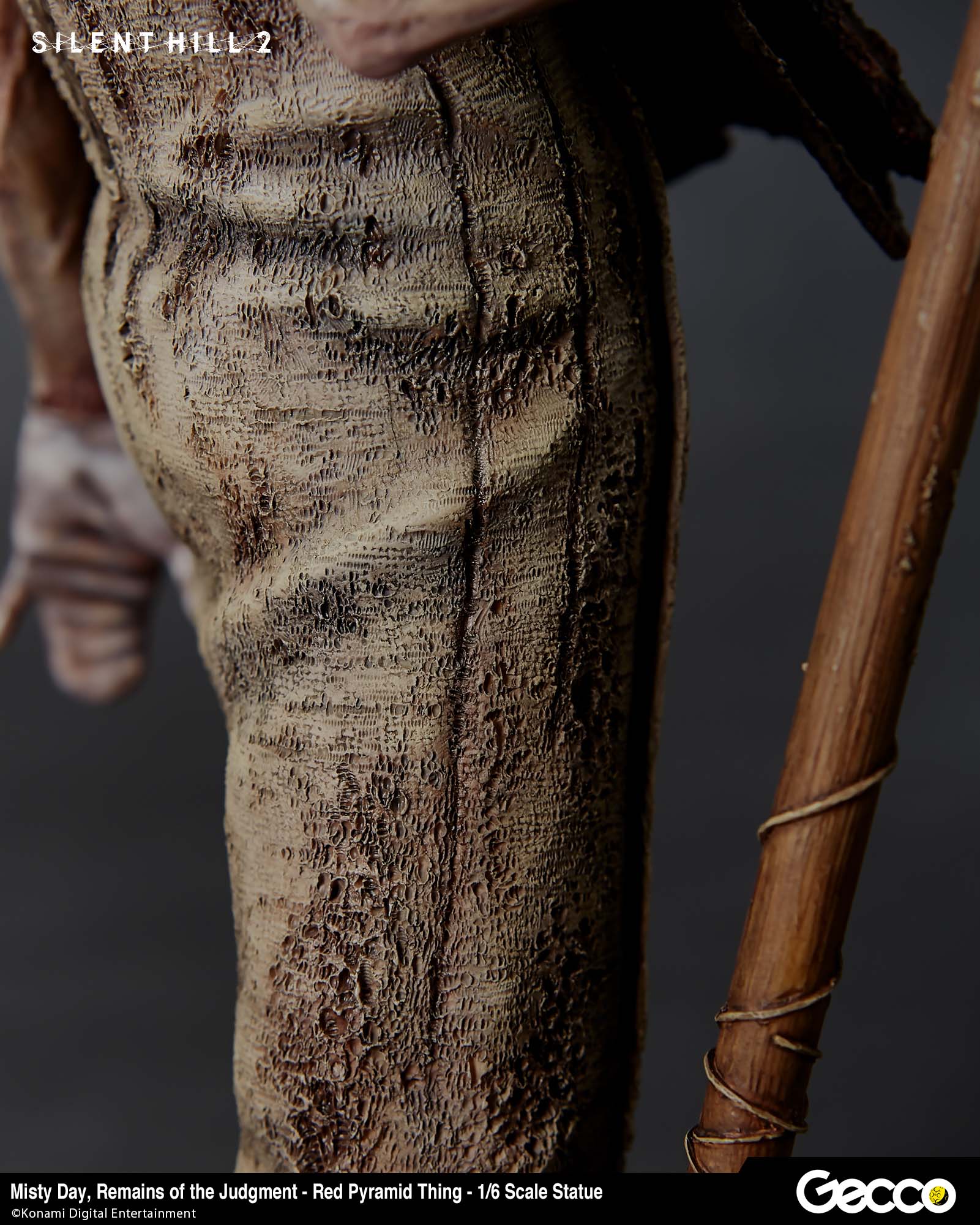 レッドピラミッドの名が示す特徴的な兜は錆にまみれた金属表現だけでなく、どこか生物っぽさを感じる側面も緻密に再現。後頭部には呼吸によって膨らんだりしぼんだりするかのような「袋」が見受けられる。痛々しい生傷や荒れた肌、浸食され綻んだ衣服など、全身に施されたディテールは、いつまでも見飽きることが無いだろう。