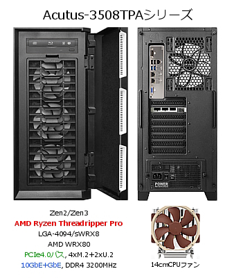 (フルタワー, AMD Zen2/Zen3 第3/4世代 Ryzen Threadripper Pro CPU, AMD WRX80 PCH, PCIe4.0(X16)バス, DDR4 DIMM, 4*M.2, 4*SATA3, GbE+10GbE, 1000W 80Plus ゴールド規格ATXプラグイン方式電源)