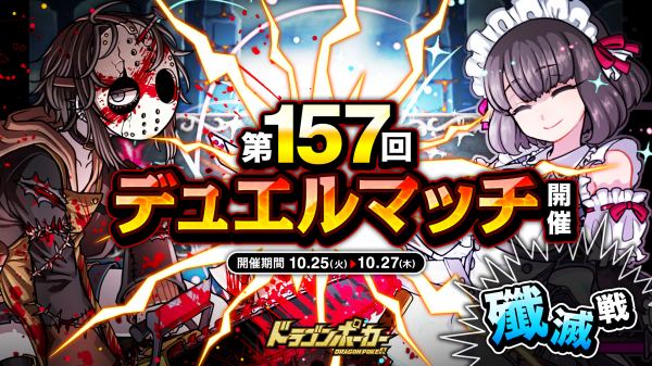 株式会社アソビズム(本社:東京都千代田区、代表取締役:大手智之)は、App Store・Google Playにて好評配信中のリアルタイム合体カードバトル『ドラゴンポーカー』で、2022年10月25日(火)より「第157回デュエルマッチ本戦」を開催いたします。