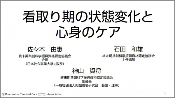 終末期共創科学振興資格認定協議会と一般社団法人知識環境研究会のメンバーは、「終末期の状態変化と心身のケア」について、「共創的ターミナルケア」という概念を踏まえて講義(本年度はWEB研修のため動画と資料の提供)を行いました。