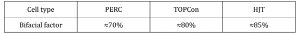 もとより左右対称な構造を持つHJTのセルは本質的に両面受光型セルであり、図2.2.で示されるように、現時点で最も高いバイフェイシャリティを誇るセル技術です。同じ応用シナリオのもとでは、バイフェイシャリティが高いほど、裏面の発電量利得が大きくなります。HJTモジュールのバイフェイシャリティは85%程度であり、表2.1.に示すようにPERCモジュールよりも15%、TOPCon より5%高くなっています。
