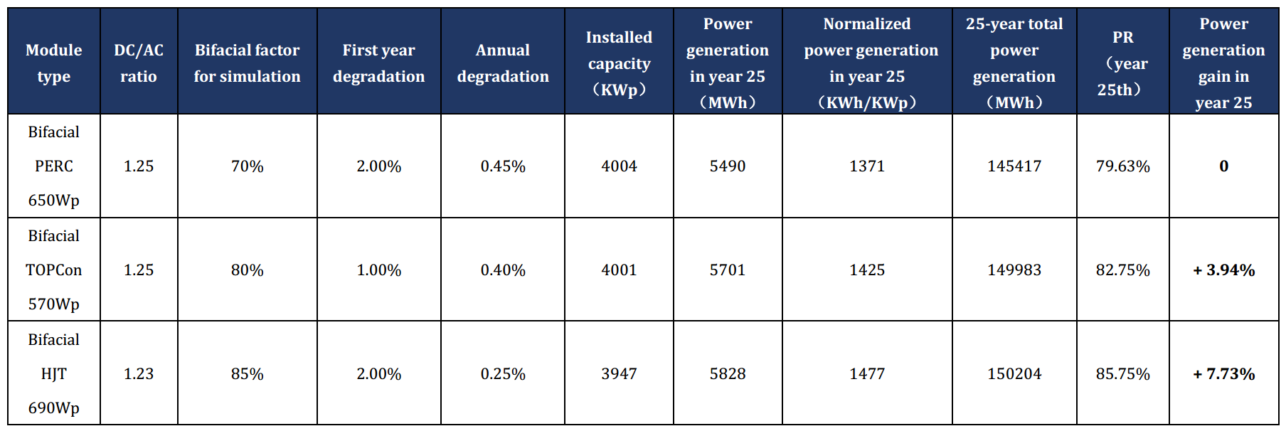 低温での応用シナリオの舞台としては北緯約45.9°、年間の平均気温4.7°C、水平日射量合計が1347 KWh/m2のハルビンが選ばれました。発電所は、DC/ACレシオが1.25、設備容量が4MW (実際の設計においては若干差が生じています)で、最大限に傾斜させた固定ブラケットと、適切なストリング・インバータを用いるという設計になっています。表3.1に示したように、25年目時点でPERCの発電量に対するTOPCon の発電量利得は3.94%であり、これに対してHJT は7.73%で、更に上回りました。