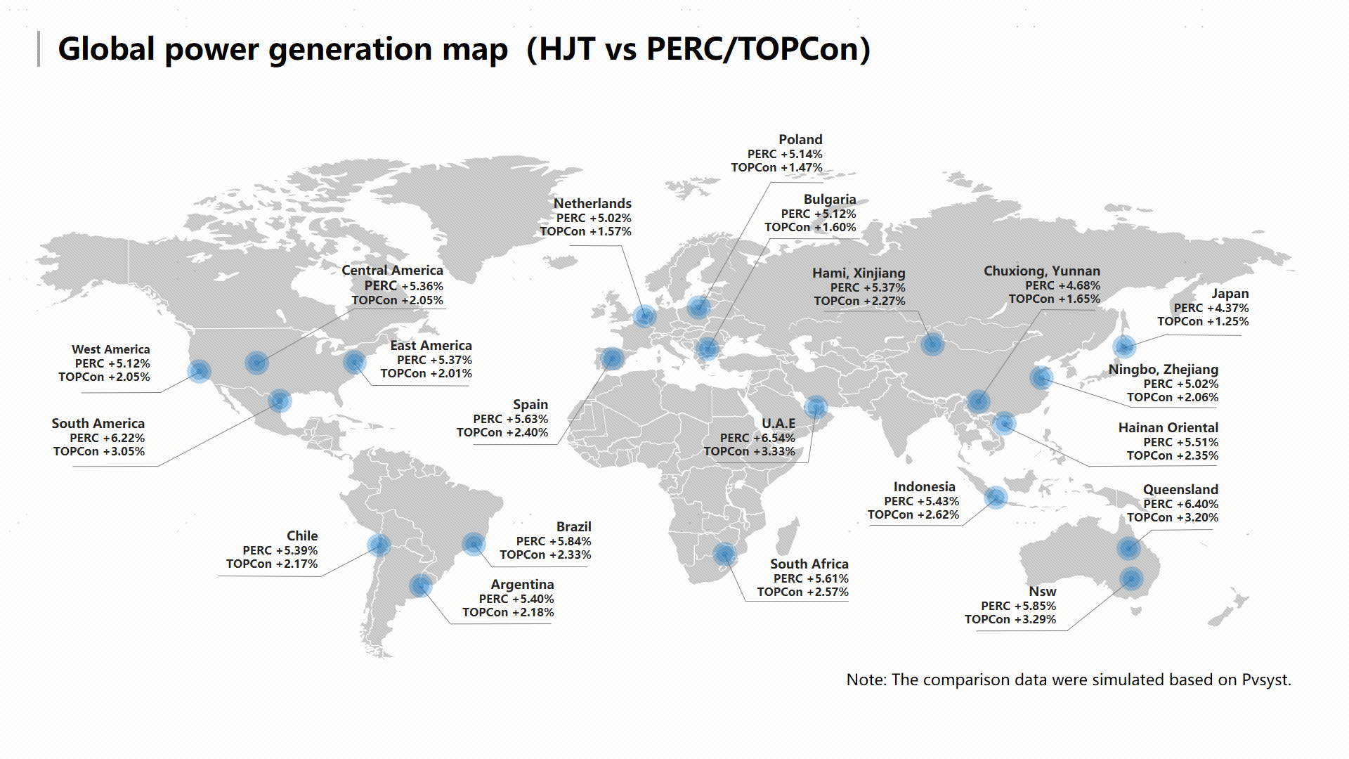 ライセンエネルギー(Risen Energy Co., Ltd)はこれを受けて、これら3種のセル技術の主要パラメータを収集し、大規模発電所で3種類のセルを用いて25年間のライフサイクルを通して得られた発電量を、世界中の異なる気候の典型として選んだ21の地域や国で測定し、世界各地における発電量利得を比較するマップの作成を試みました。