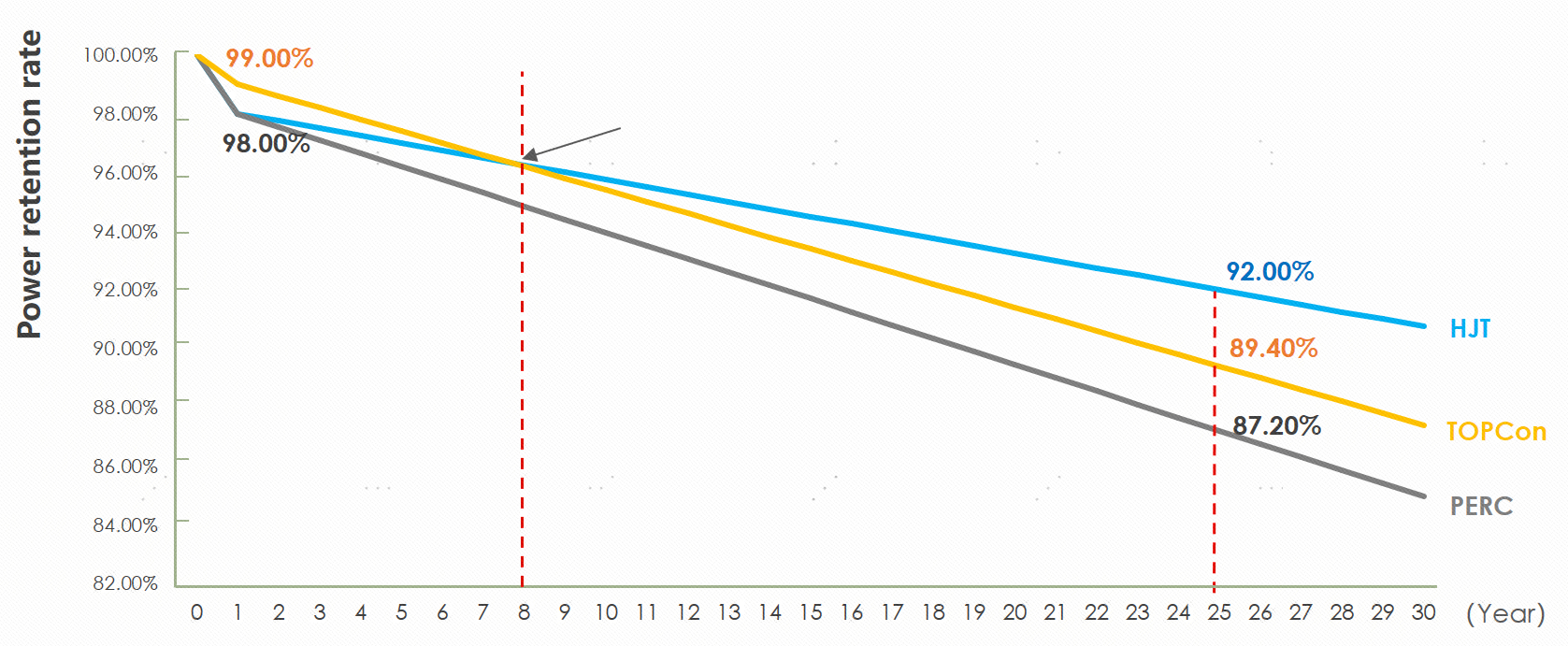 3種類のセル技術における出力低下曲線を見ると、25年目の終わり時点におけるHJTモジュールの電力保存率は92%であるのに対して、PERCモジュールでは87.2%、TOPConモジュールでは89.4%となっています。これは、大型発電所のライフサイクル全体を通してHJT製品の出力電力保存率が最も優れていることを示しており、図2.3が示すように、これによってより安定した、比較的高い発電量が得られるようになります。