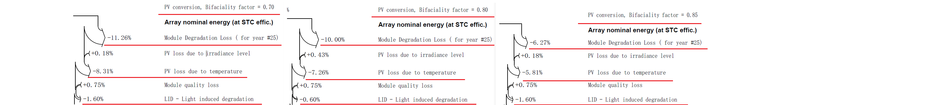 損失を比較した場合、低温環境での応用において発電量に影響する最も重要な要素は、出力低下です。図3.1に見られるように25年目の終わりには、PERCモジュールの出力低下は12.86% (1.6% + 11.26%)、TOPConモジュールは10.6% (0.6% + 10%)、HJTモジュールでは7.87% (1.6% + 6.27%)でした。