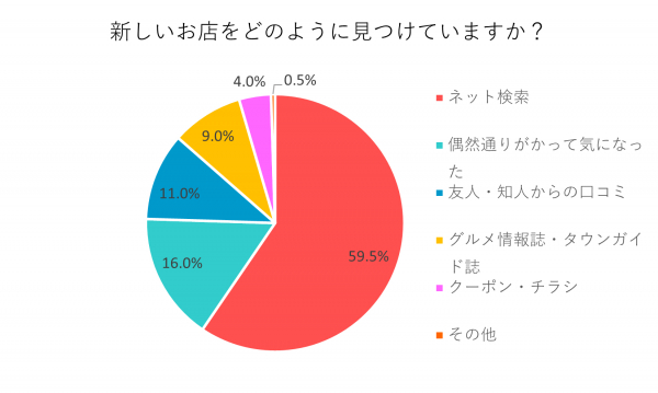 「ネット検索」が59.5%、「偶然通りがかって気になった」が16%、「友人・知人からの口コミ」が11%、「グルメ情報誌・タウンガイド誌」が9%、「クーポン・チラシ」が4%、「その他」が0.5%でした。