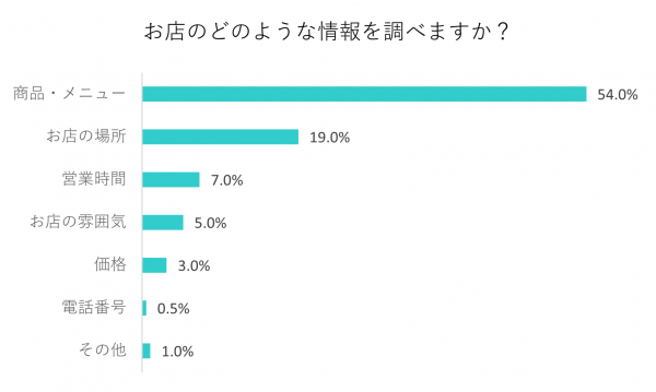 最も多かったのが「商品・メニュー」で54%、次いで「お店の場所」19%、「営業時間」7%、「お店の雰囲気」5%、「価格」3%、「電話番号」0.5%、「その他」1%という結果に。新しいお店を訪れる際は商品・メニュー情報やお店の場所などを調べる人が多いようです。