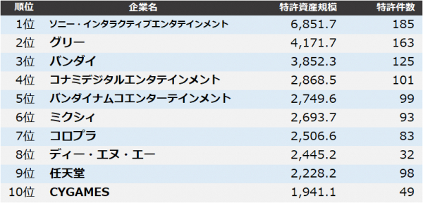 4位 コナミデジタルエンタテインメントは「動作対象の動作自由度を向上させたゲームシステムプログラム」、5位 バンダイナムコエンターテインメントは「対価パラメータを消費して使用可能状態になるゲーム媒体を用いた、興趣性を高めたゲームシステム」などが、それぞれ注目度の高い特許として挙げられます。