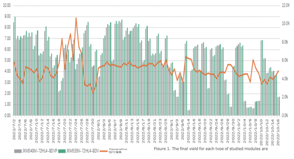 この調査は、P型PERC両面モジュール(JKM540-72HL4-BD-VP)とN型TOPCon両面モジュール(JKM555N-72HL4-BDV)の評価に特化しています。7月から10月までの4ヶ月間のデータを収集しました。モジュールの温度、両面特性、および効率に対する放射照度の影響を調査しました。P型PERCモジュールの効率は、特に7月と8月の気温上昇とともに低下することを示しています。それに対し、N型TOPConモジュールの効率はより安定しています。 N-Topconモジュールの高い両面特性と一軸架台、白い塗装により、発電量に大きく増加させました。