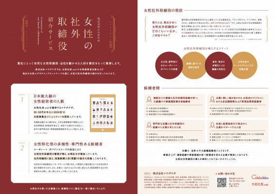<「女性の社外取締役人材紹介サービス」について> http://joseishacho.net/female_officer/「女性の社外取締役人材紹介サービス」は、女性社長.netの女性経営者会員3,100名、そして独自の女性エグゼクティブネットワークを通じて最適な候補者を選定し、社外取締役候補として企業様へ紹介します。また、はじめて社外取締役に就任される女性経営者をはじめ、社外取締役経験がある女性へのサポートも行っています。